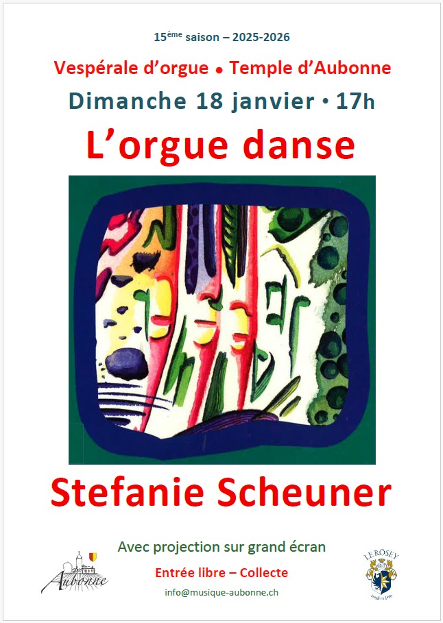 Temple d'Aubonne AubonneVespérale d'orgue • Temple d'Aubonne • Dimanche 18 janvier • 17h L'orgue danse Stefanie Scheuner Avec projection sur grand écran | Entrée libre – Collecte