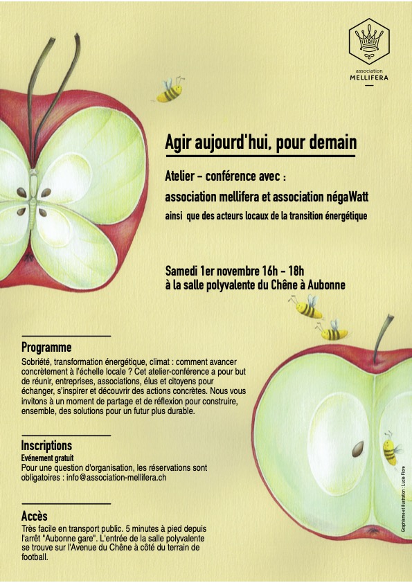 Centre Culturel et Sportif du Chene AubonneL’association mellifera et l'association négaWatt organisent un atelier - conférence à Aubonne sur le thème de la sobriété, de la transformation énergétique et du climat. Samedi 1er novembre de 16h […]
